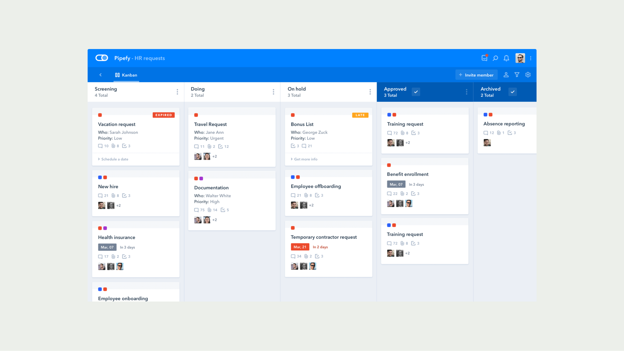 Exemplo de uso: Gerencie processos de aprovação e solicitações internas, onde cada etapa é visualizada e monitorada em um quadro Kanban.