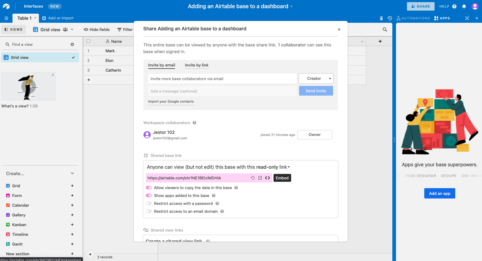 2 Steps to Add an Airtable base to a dashboard - no code required