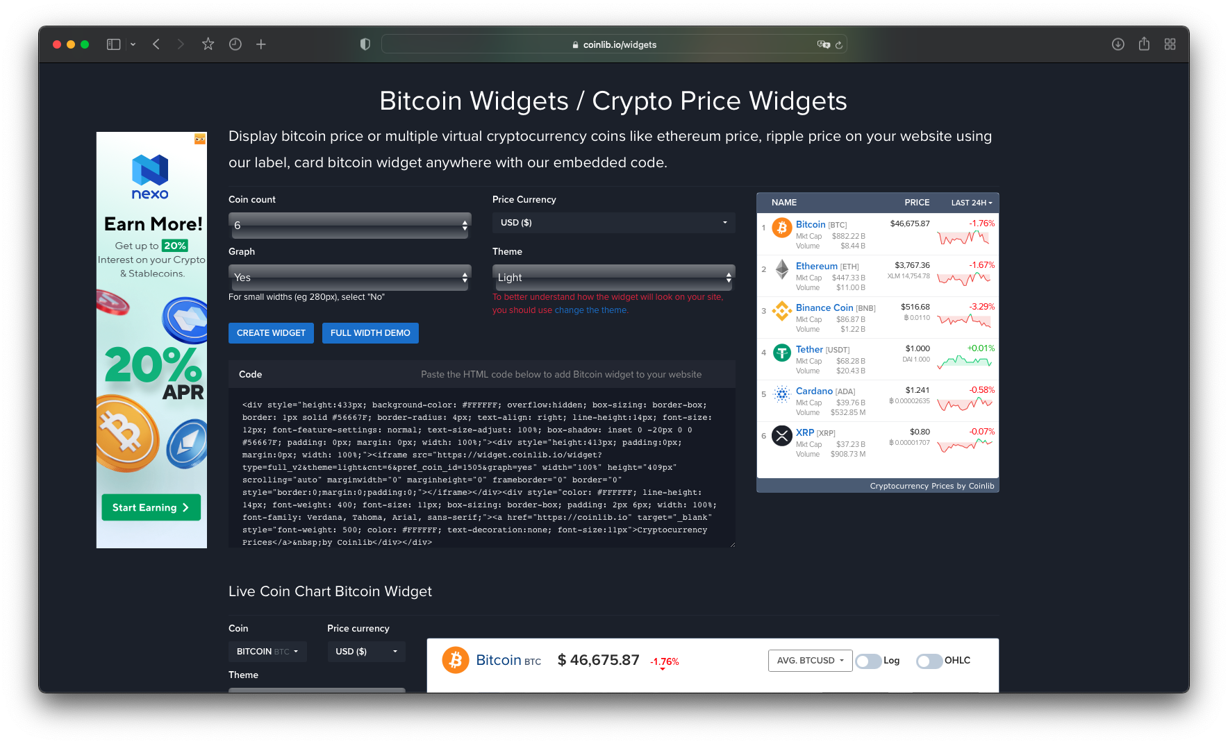 widgets section in Coinlib. There, you can find and customize a myriad of widgets, from charts with price history to calculators. We’re going to go with the first one, the one that displays the price of multiple coins. After you’re done setting it up, copy the code snippet in the “Code” box.