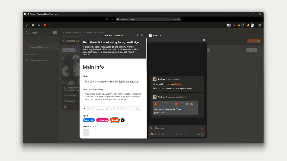 Additionally, Jestor's Chat includes features typical of communication software, such as thread-based conversations, emoji reactions, and valuable tools like audio messaging and AI-powered speech-to-text for summarizing or transcribing audio messages.