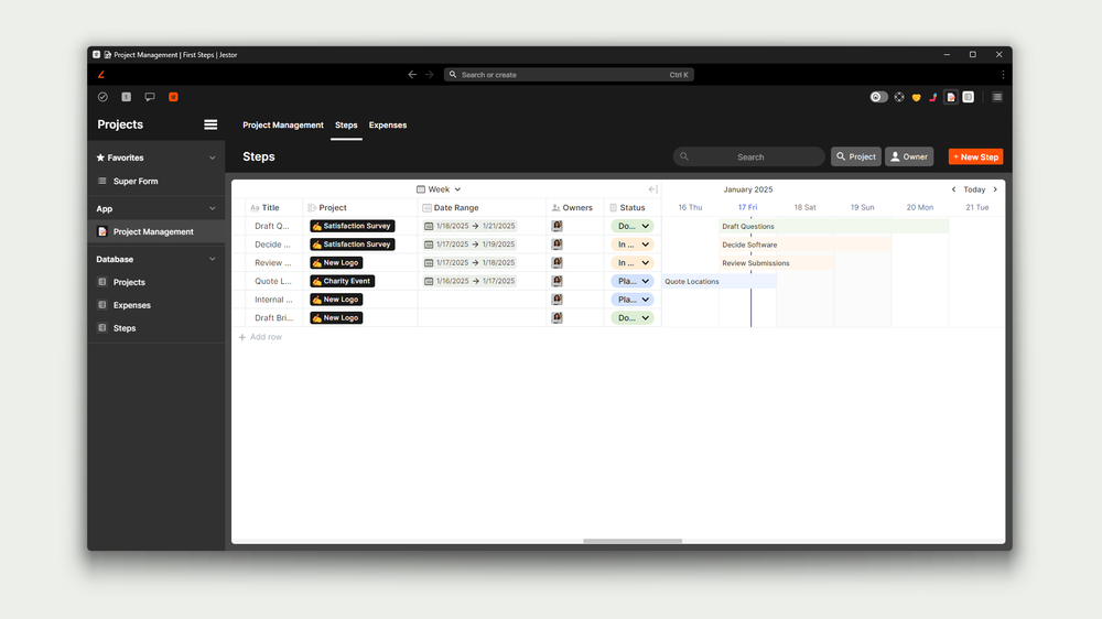 One of the key advantages of Jestor is its exceptional flexibility, enabling it to accommodate a wide array of use cases. Unlike tools that are restricted or highly specialized in one feature, Jestor functions as an internal app builder. While some processes fit perfectly with kanban boards, others are better addressed with Gantt diagrams, tables, forms, or even lists with action buttons.