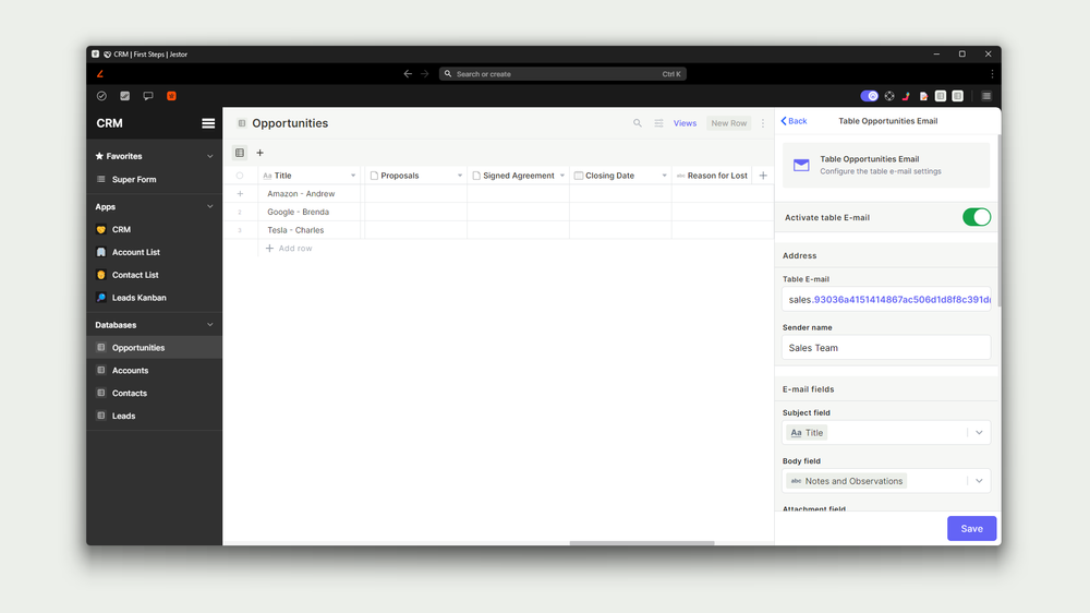 Jestor offers an email-to-database feature, enabling you to create a dedicated email address linked to a specific table. This setup ensures that any email sent to this address automatically generates a card on the database, capturing essential details like the sender's information and any attached files.