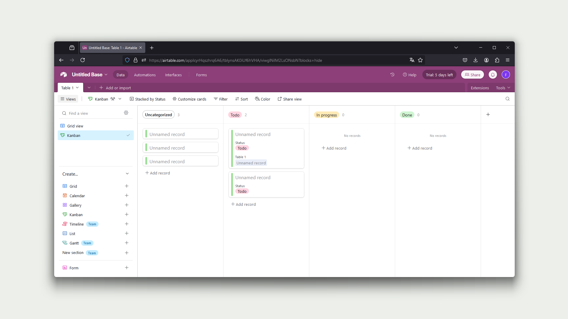 Airtable allows users to create automations either through its Automations tab or through Button fields. With this feature, for example, it’s possible to set up a rule that updates the card’s name as soon as it’s created, or sends an e-mail at the click of a button.