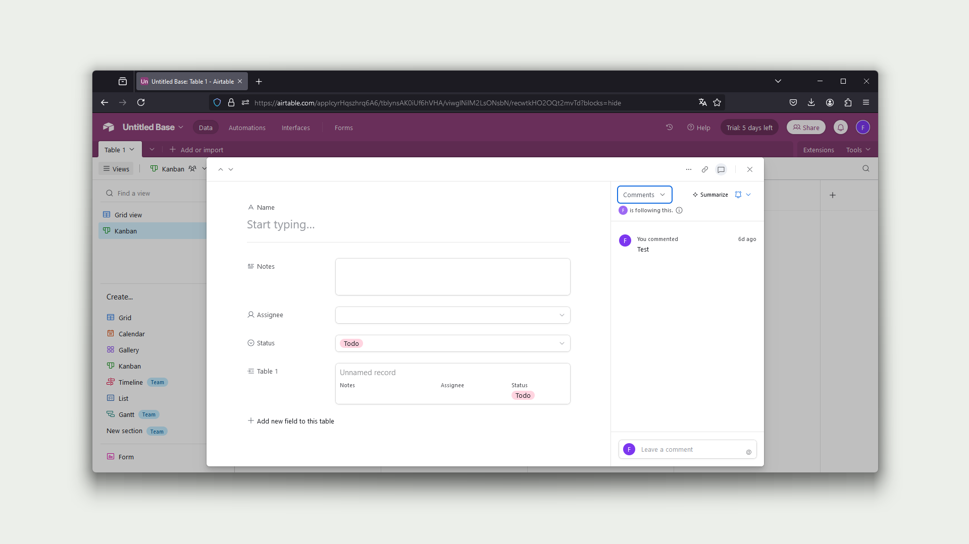 Airtable allows for users to comment on cards, which is the standard practice when amongst all similar software. Users get notifications when they are tagged in comments, and though there aren’t any advanced features (like formatting or threads,) it will get the job done in simpler use case scenarios.