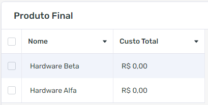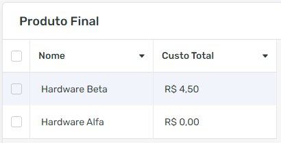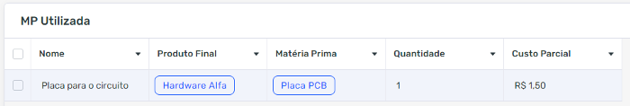 Aqui vemos que pelo menos uma parte da automatização já funcionou. Como o Hardware Alfa consome apenas uma Placa PCB, o custo parcial é de R$1,50. Vamos voltar para o cadastro de Produto Final e ver se o custo total do produto reflete esse lançamento: