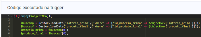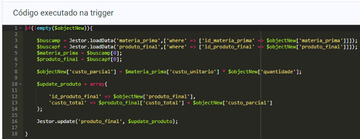 A primeira automatização então é a de criação, e para isso adicionamos nossa primeira trigger, que chamaremos de CriarMP e será ativada Antes de o registro ser criado. Utilizando os conhecimentos dos métodos nativos do Jestor (que você pode verificar de forma rápida na documentação ou na nossa introdução de PHP), sabemos que o código será algo como: