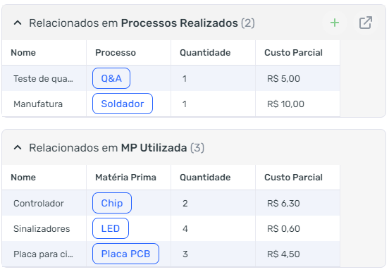 - Similarmente, quando um registro em Processos realizados é criado, atualizado ou excluído, deve-se calcular o custo parcial referente a este registro e alterar o custo total do Produto Final.