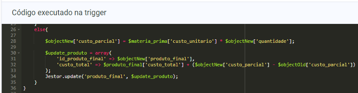 O que esse código está fazendo? Procurando as informações tanto da Matéria Prima selecionada quanto do Produto Final atrelados, calculando o custo parcial desse lançamento e somando ao valor que já existia de custo total do Produto Final.