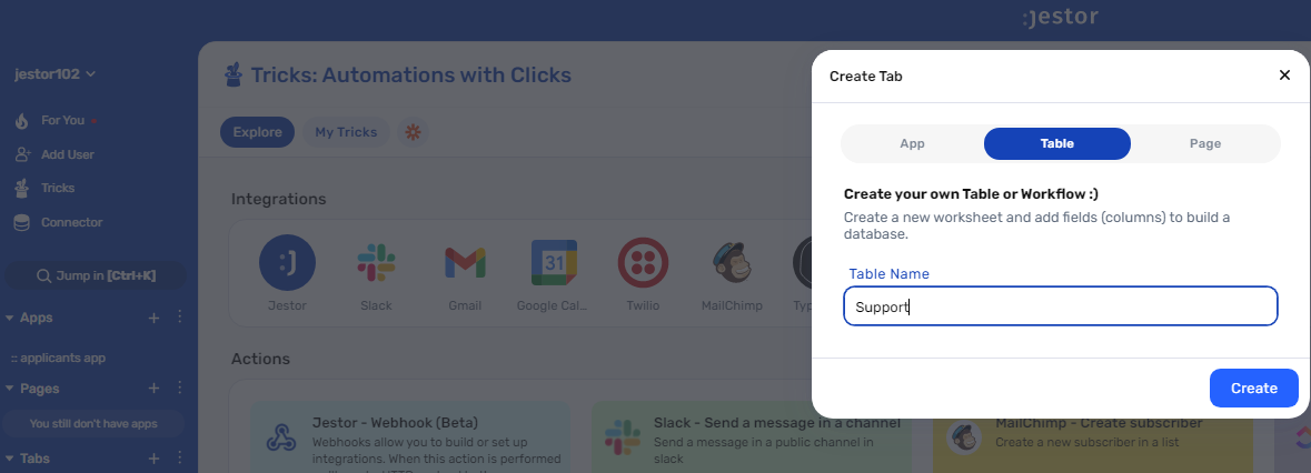 tablein Jestor, name it “Support”, and add all the fields you'll need for the process. For example, you'll usually need a short description, priority and team responsible for solving the problem (such as Tech or Billing). Create a