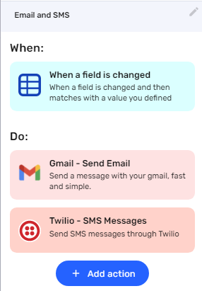 When a field is changed. In this example, what we're going to do is send an email and an SMS text message when they reach the “Greetings” status. Select the "Onboarding" table, as a condition choose the field Status, then write Greetings.