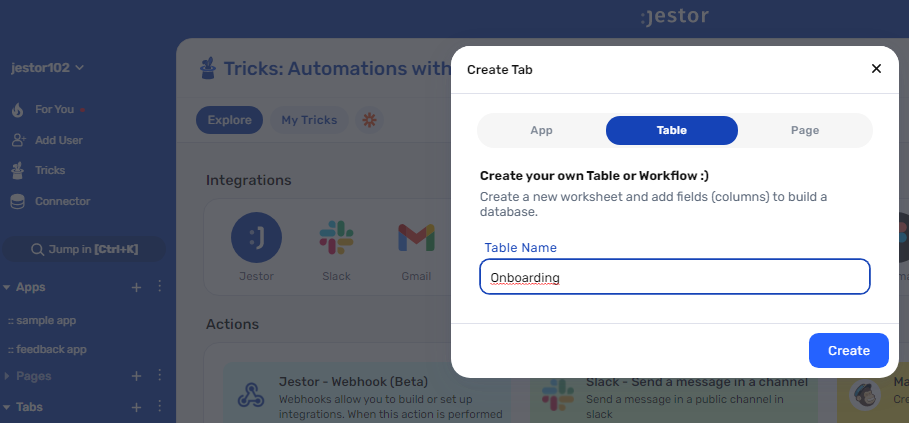 tablein Jestor, name it “Onboarding”, and add all the fields relevant to the process (usually, things like a client’s name and contact information, as well as what services they requested). Create a