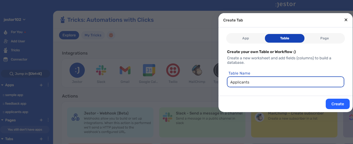 tablein Jestor, name it “Applicants”, and add all the fields you'll need for the process, which in this case will be all the fields created in the form from step one. Also, create a