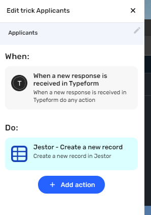 Jestor - Create a new record” action. Select the “Applicants” table and match the information coming from the form to the fields in the list. Now, every time someone submits the form, the information will be automatically sent to Jestor.