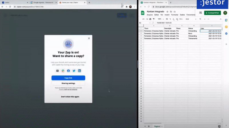 5º) Go back to Zapier and click on “Test trigger”. All the information that was filled out in the Kanban card will be displayed. Click on “Continue” if the test runs successfully.