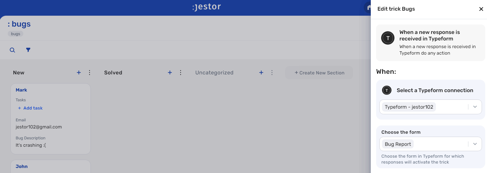 Now, as the trigger for this automation, select When a new response is received in Typeform. Connect your Typeform account and select the form you’ve created in Step One in the “Choose the form” dropdown field. Save this and choose the “Jestor - Create a new record” action. Select the “Bugs” table and match the information coming from the form to the fields in the workflow. Now, everytime someone submits the form, the information will be automatically sent to