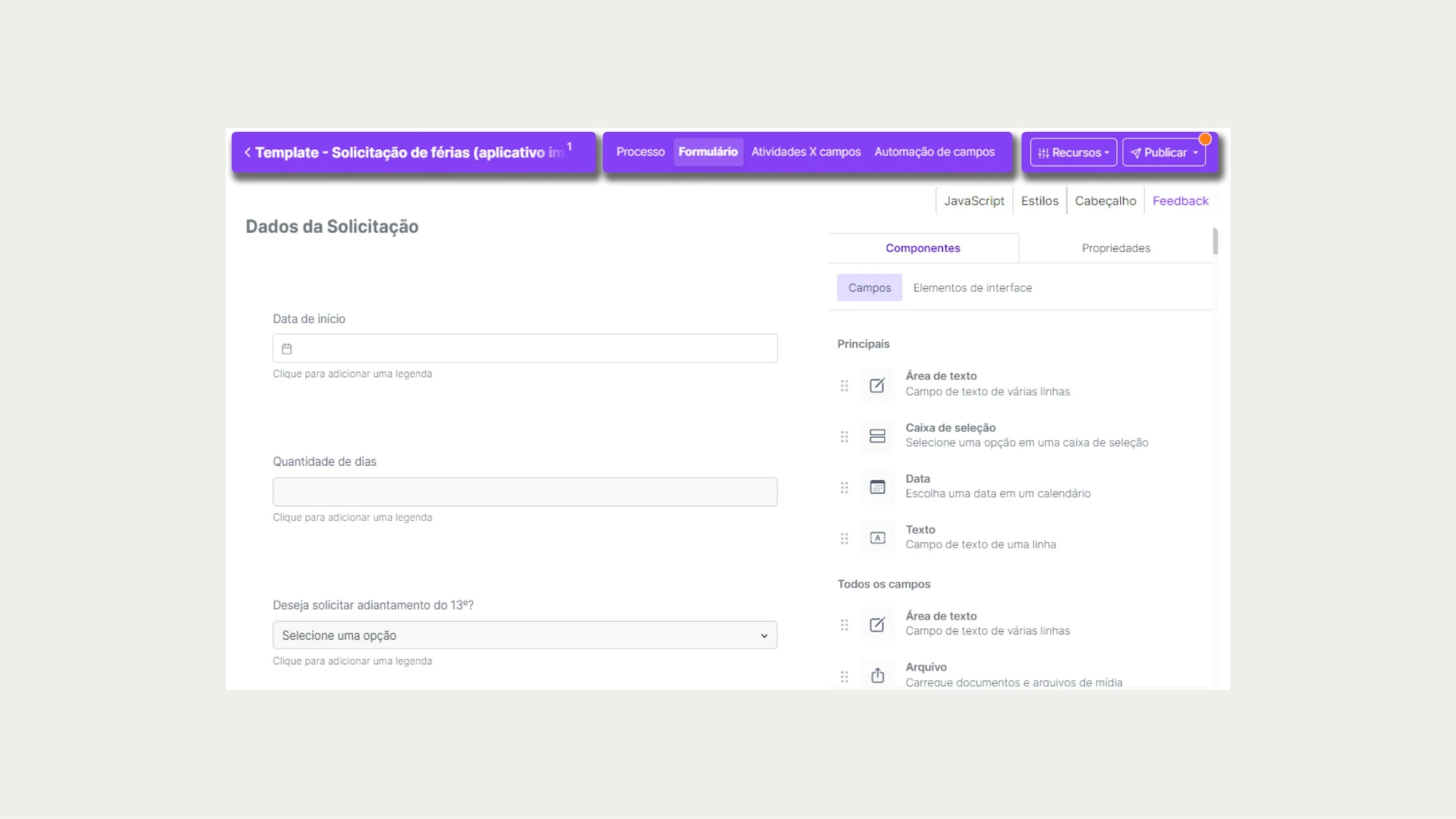 Exemplo de uso: Automatização de processos de RH, como requisições de férias e admissões, com formulários customizados e notificações automáticas para os responsáveis.