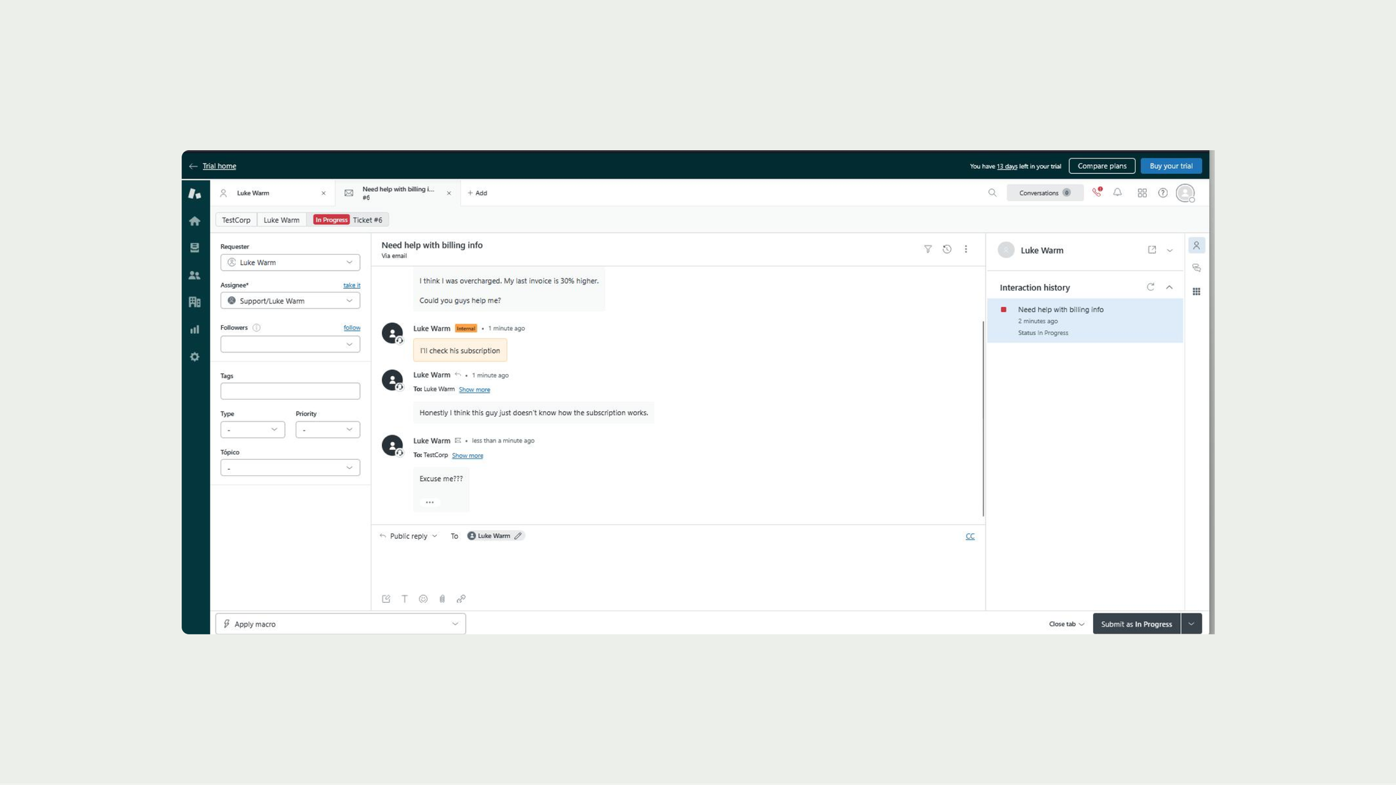 Exemplo de uso: Uma equipe de suporte utiliza o Freshdesk para gerenciar tickets de TI e de RH, com automação de respostas e relatórios que ajudam a identificar oportunidades de melhoria.