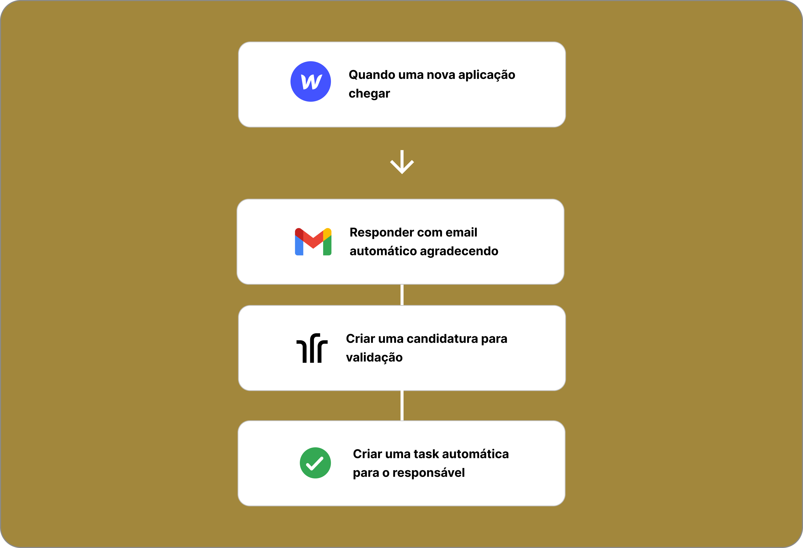 Reduza o tempo perdido em tarefas manuais com automações e integrações no-code. Nunca mais deixe seus candidatos sem resposta.