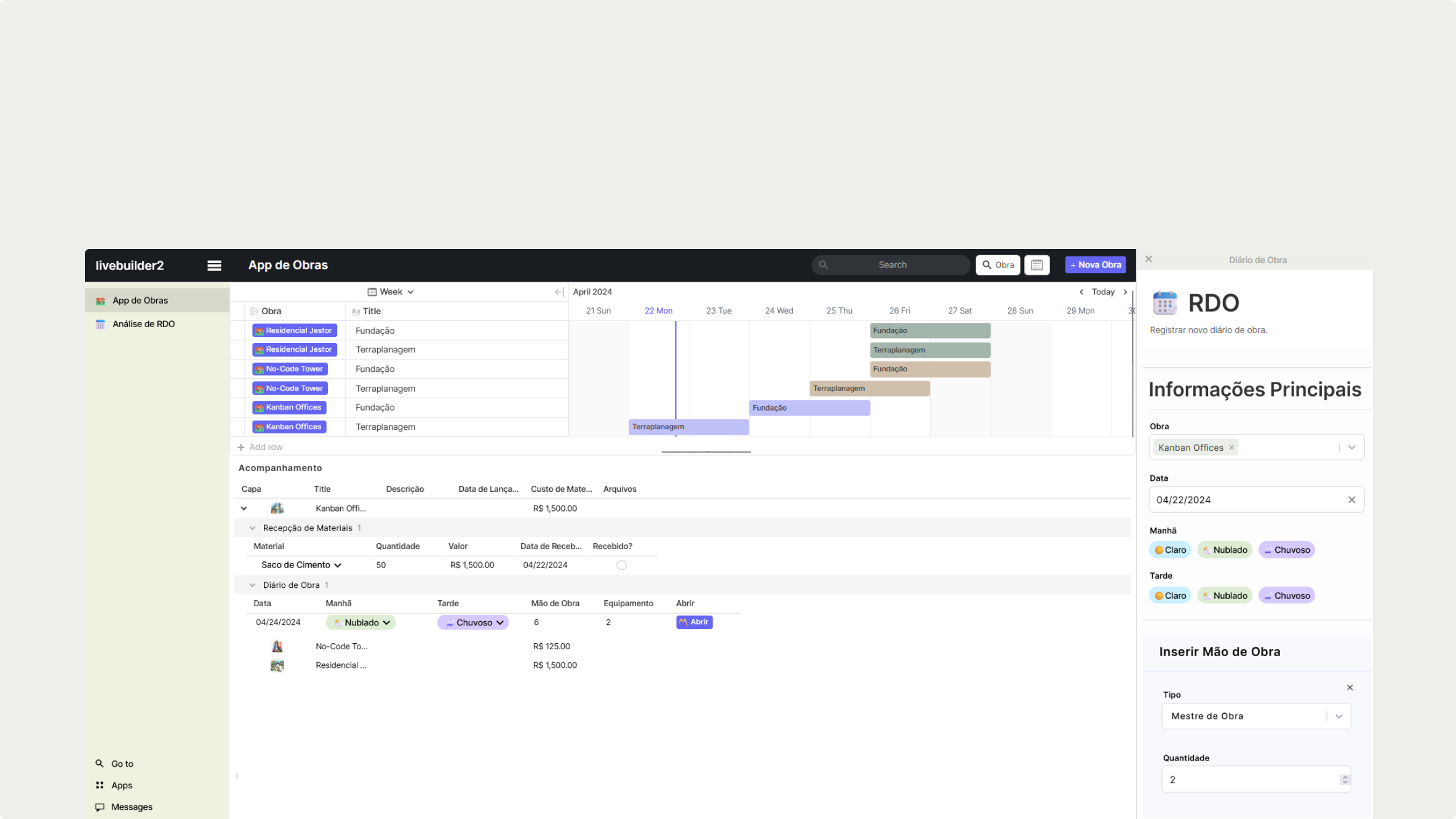 Sistema 100% Customizável: RDOs, Diário de Obras, Gestão de Custos e Prazos, e mais.