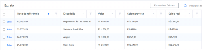 Na imagem acima, temos uma previsão de fluxo de caixa (Saldo Previsto) que indica um fechamento de mês positivo. No entanto, ela é inteiramente dependente de recebermos de fato o valor da Venda #1 no dia 30/07. Caso esse recebimento atrase alguns dias, o cenário muda: