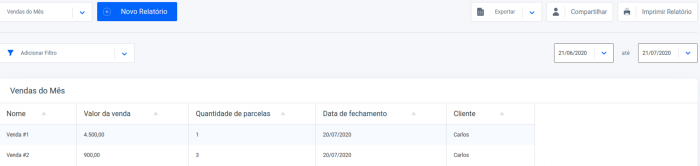 A imagem abaixo, por exemplo, mostra um relatório de todas as vendas do dia 21/06 a 21/07, bem como a quantidade de parcelas: