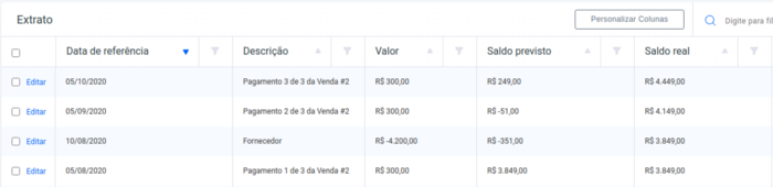 No exemplo abaixo, a Venda #2 poderia ter tornado o fluxo de caixa positivo mas, por ser parcelada, não foi possível receber esses valores a tempo.
